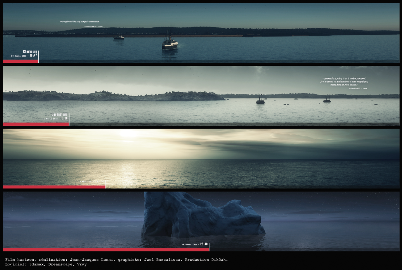 Pour commémorer le départ du Titanic de Cherbourg en 1912 et faire revivre sa traversée tragique, la Cité de la Mer de Cherbourg s’est doté d’un écran géant (36 mètres) qui diffuse en 20 minutes la réelle traversée du Titanic jusqu’à sa rencontre avec l’iceberg qui lui a été fatale.
